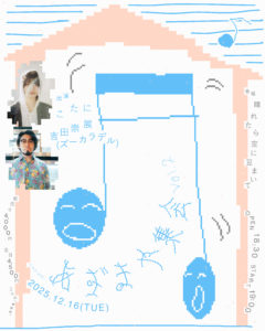出演:こたに、吉田崇展 (ズーカラデル)チケット代:前売り ¥4,000- / 当日 ¥4,500 (D代別/自由席)